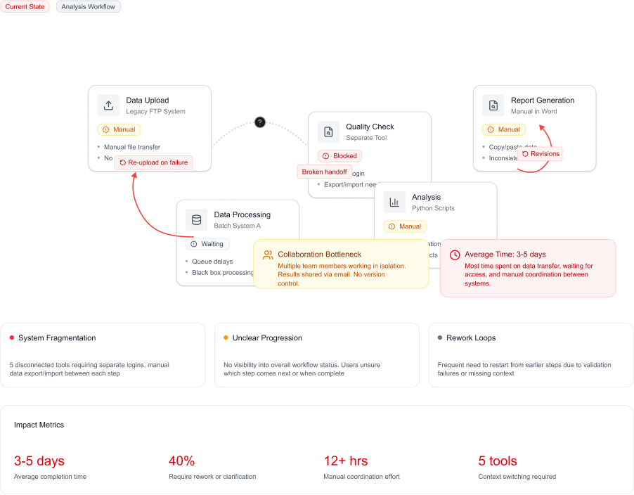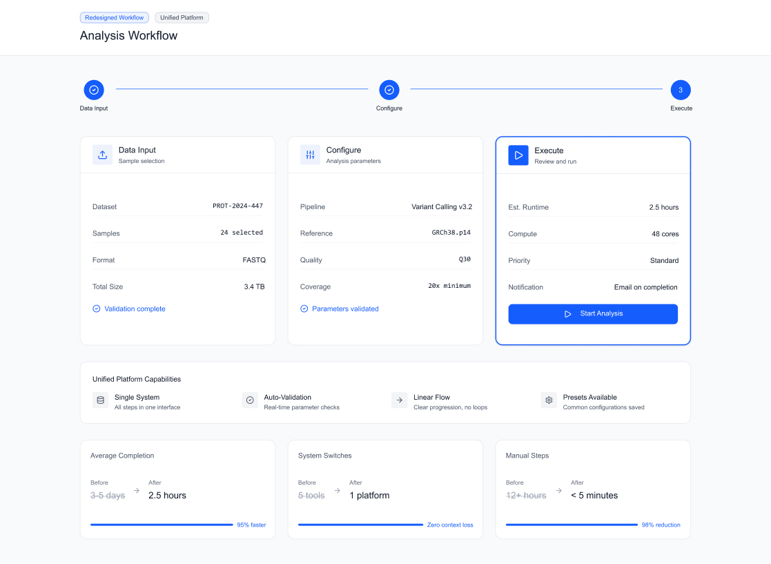 A complex internal tool used by research teams to process genomic datasets. The challenge wasn’t visual; it was the workflow itself. Scientists were losing time and making avoidable mistakes because the process was scattered, unclear, and mentally heavy