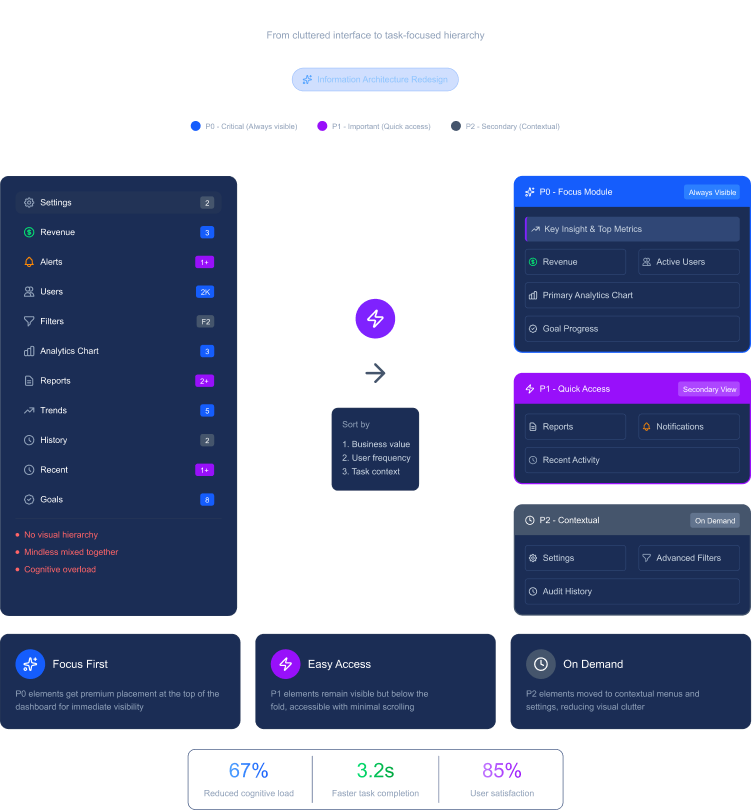 I started by mapping everything on the dashboard and understanding user workflows. I worked with product to categorize every element as P0, P1, or P2 based on actual usage and business value.